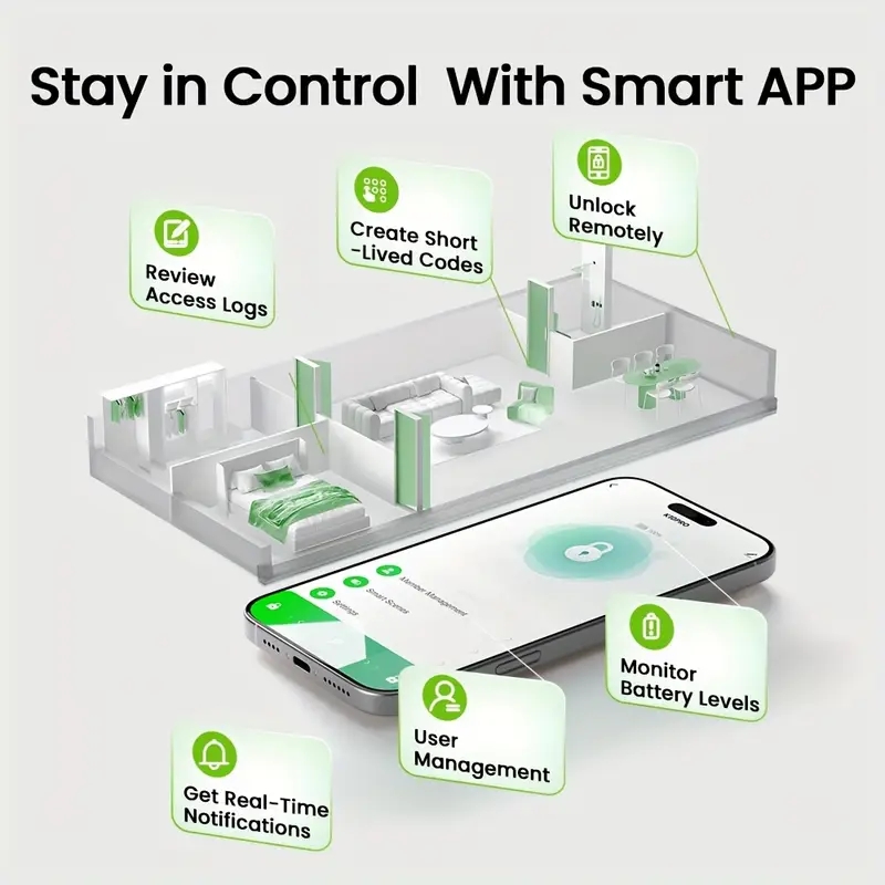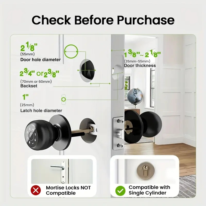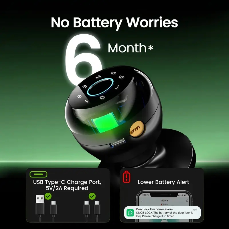 Door Handle Lock, App-Controlled Wireless Connection, 400mAh Battery Rechargeable via USB Type-C Cable (C-to-C cables not supported). Keyless entry door lock suitable for wooden or steel doors measuring 3.5-5.5cm (1.38-2.18 inches). Perfect for homes, bedrooms, apartments, offices, and garages.